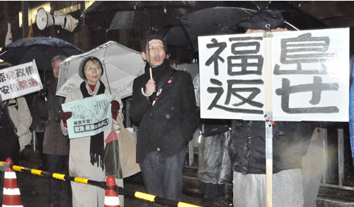 (写真 4月10日夜、季節外れの冷たい雨を吹き飛ばす勢いで恒例の反原発金曜日行動が首相官邸前で闘われ、原発再稼働阻止・安倍打倒の声があふれた)
