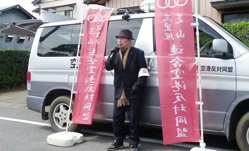 北原鉱治事務局長は、成田市川上地区、本三里塚地区の2カ所で辻立ち演説を行った。「反対同盟は3月29日、47年前に実力闘争を闘った旧市営グラウンド、今の栗山公園で集会を行い、デモで市民のみなさんと交流しました」「みなさんは、空港ができて騒音問題と過疎化に苦しんではいませんか」と語りかけた。