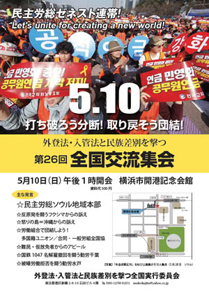 5月に東西で開かれる「外登法・入管法と民族差別を撃つ交流集会」(5・10全国集会、5・24関西集会、主催/外登法・入管法と民族差別を撃つ全国・関西実行委員会)に、民主労総ゼネスト決起に連帯して結集しよう。民族・国籍・国境を越えた労働者の団結、国際連帯をさらに大きく発展させ、革命へ向かった新たな前進を切り開こう。