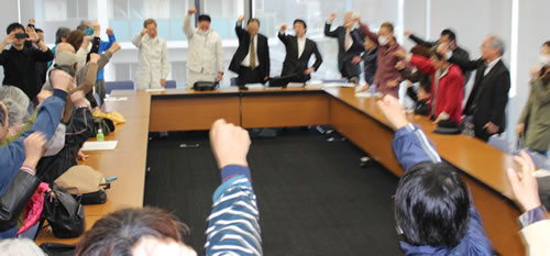 裁判後、弁護士会館で集会を行った。まず、3人の弁護士が発言し、その後、総決起した植木団地労働組合の仲間と家族が次々と決意を表明した。続いて、全国水平同盟の仲間、新たに全国水平同盟に結集して住宅追い出し攻撃と闘うと決意した労働者、労働組合が次々と発言した。みな口々に「団結こそ命、核戦争情勢だからこそ団結して闘おう」と訴えた。