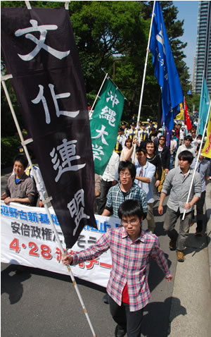 4月28日、全学連が呼びかけた沖縄デー闘争が法政大学―新橋―国会前で闘われた。日米安保新ガイドラインと日米首脳会談、戦争・安保法制への怒りとともに、韓国ゼネスト連帯、そして同日、沖縄・県庁前で闘われた辺野古新基地建設絶対阻止の闘いとの連帯を貫く首都・東京での行動として、うち抜かれた。