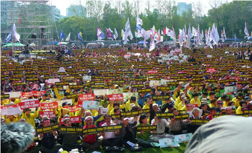 4・24ゼネストを打ち抜いて結集した組合員は手に手に「かちとろう! 最低賃金1万ウォン」のスローガンを掲げ、パククネ打倒まで徹底的に闘いぬくという決意が会場にあふれた。