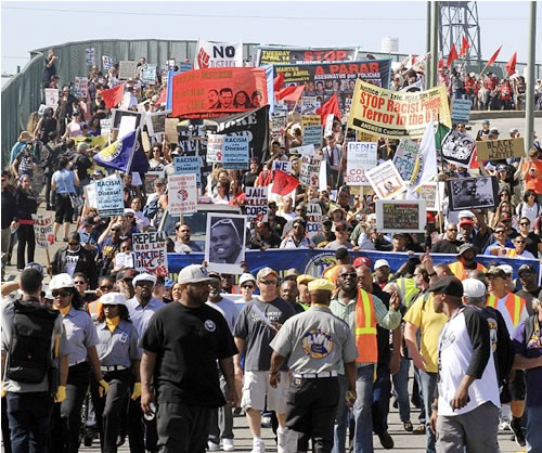 5月1日、ILWUローカル10(国際港湾倉庫労組第10支部)は、オークランド港の荷役を完全に止めた。米東海岸の港湾労組ILA(国際港湾労組)ローカル1422の3人の組合員の親族であるウォルター・スコット氏が4月4日に警察に虐殺されたことを弾劾し遺族やILAの仲間と連帯するための闘いだ。昨年8月6日のミズーリ州ファーガソンでの警察による虐殺への弾劾闘争を機に、警察の暴行・殺害との大規模な闘いが全米各地に広がったが、当局は労働者居住地域に、米軍装備をそのまま流用した装甲車・自動小銃などで重武装した警察機動隊や州兵を差し向けた。殺害した警官は、ことごとく不起訴・放免した。全米で警官の殺害事件はますます増加し、今年に入ってから1日あたり3件になっている。