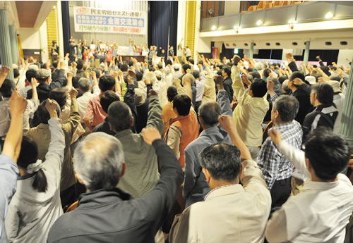 在本土沖縄労働者会議の宮里勝博さん(なんぶユニオン委員長)が「沖縄全島ゼネストを組織しよう」とアピール。4年目の3・11反原発福島行動を闘った福島からいわき合同ユニオンの小宅貴史副委員長、被曝労働拒否をストで闘う動労水戸の辻川慎一副委員長と続いた。辻川さんは「全国に動労総連合をつくり、日本でゼネストを闘おう」と大号令を発した。