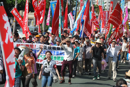 これに対して直ちに5月17日、灼熱(しゃくねつ)の沖縄・那覇セルラースタジアムに結集した3万5千人が怒りをたたきつけた。国鉄闘争と解雇撤回・基地撤去、沖縄全島ゼネストを訴える5万数千枚のビラが配布され、沖縄の怒りと完全に一体化した。『前進』が飛ぶように売れ、「ゼネストをやろう」が闘う全沖縄県民の合言葉となった。