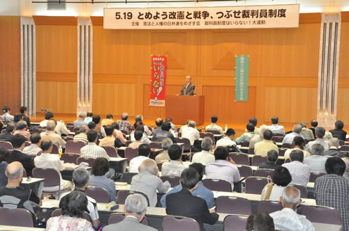 5月19日夜、東京・霞が関の弁護士会館講堂クレオで「とめよう改憲と戦争、つぶせ裁判員制度」集会が360人の参加で開かれた。主催・協賛は「憲法と人権の日弁連をめざす会」など4団体。