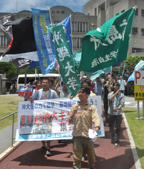 県民大会3万5千人決起と全島ゼネスト情勢をキャンパスに持ち込み、学生自治会拠点を強固に打ち立てる闘いとして、5月18日の沖大学内集会と那覇市内デモが打ち抜かれた。沖大自治会の赤嶺知晃委員長と盛島琢允副委員長を先頭に昼休みのキャンパス中央中庭集会が沖大生の圧倒的な注目と合流によってかちとられ、戦闘的な学内デモを貫徹した。沖大当局の集会破壊策動はすべて無力化された。沖大生と全国学生のデモ隊はそのまま市内デモへと飛び出し、市民との結合を実現しながら、ものすごい高揚感をもって与儀公園までのデモをやりきった。キャンパスにおける力関係は劇的に転換した。昨年5月、初の沖大キャンパス集会に恐怖した当局は、学生証チェックを強行し、教職員のみならず一部学生まで組織して「帰れコール」をやらせたが、今年は何の妨害もできず、反動教授と職員どもが集会を恐る恐る観察することしかできなかった。すばらしい開放感が構内にあふれた。