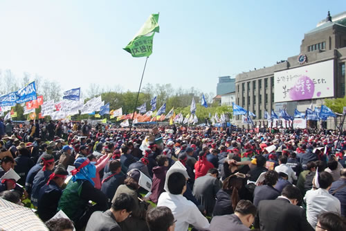 5月1日のメーデーでは韓国労総も、パククネが反労働者的政策をなおも強行するなら、民主労総とともにストに立つとの決意を表明した。セウォル号遺族の不退転の決起と警察権力との大激突が示すように、危機を深め、ますます凶暴化するパククネ政権への怒りは今や、全社会・全人民の中に爆発的に広がっている。それはついに労資協調路線の韓国労総をも下から突き動かし、全労働者階級の総蜂起へと向かう情勢を切り開こうとしている。