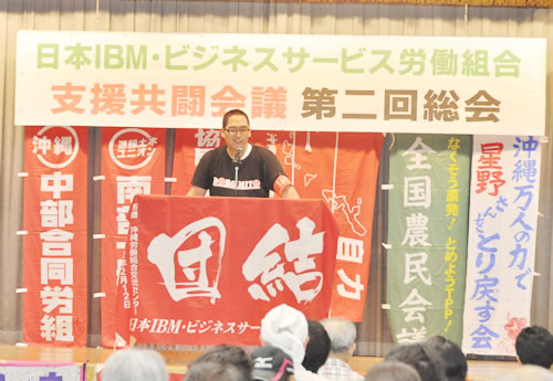 5・15沖縄闘争2日目の16日夕方、IJBS(日本IBM・ビジネスサービス)労組支援共闘会議第2回総会が沖縄県青年会館で開かれ、180人が結集した。第2回総会は、IJBS労組と支援共闘会議の青年労働者が沖縄全島ゼネストの指導部として登場していく画期的な総会としてかちとられた。