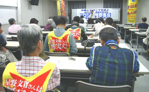 5・17沖縄県民大会の動画を上映し、「ソリダリティ」を全員で合唱。沖縄闘争から帰ったばかりの自治体労働者の司会で、広島星野さんを救う会共同代表の増上昭典さんが開会あいさつ、救う会の福崎裕夫さんが府中市上下町での絵画展の報告をしました。
