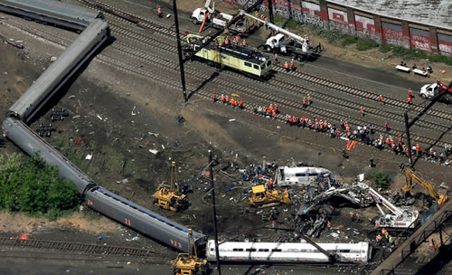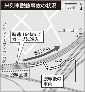 アムトラック188号列車は首都ワシントンからアメリカ最大の都市ニューヨークに向かう北東回廊路線を走っていた。フィラデルフィア駅を出発して約10分後、時速80㌔で通過すべき急カーブに倍の時速164㌔で進入し、全車両が脱線したという。