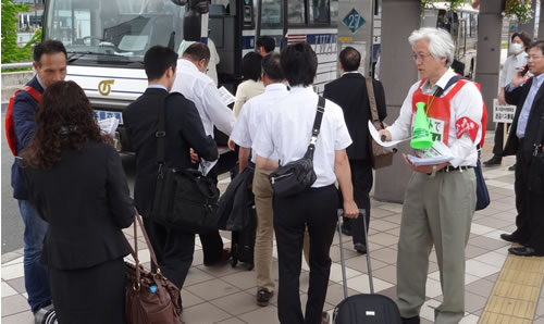 初日、全国労組交流センター自治体労働者部会は佐藤賢一代表を先頭に、会場となったホテルと盛岡駅前の送迎用バス乗り場に登場し、圧倒的な迫力で宣伝活動を展開。「現場の怒りが大阪・橋下を打倒した! ゼネスト方針を打ち立て安倍打倒へ。6・7国鉄全国集会に大結集を」と訴える部会ビラと国鉄闘争全国運動のタブロイド判のビラは、全国の中央委員と傍聴参加者に強烈なインパクトを与え、闘いの機運をつくり出しました。