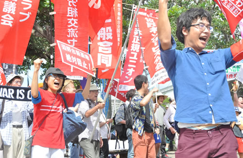 また、ある人とは署名をしてもらった後も話が続きます。安倍への怒り、特に戦争法への怒りをひしひしと感じます。「労働組合がつぶされたら、安倍首相は戦争に一気に進んでいく。逆に闘う労働組合がいっぱいになれば、ゼネストで安倍を倒せる」と話をしたら、相手の顔がグッと明るくなります。ものすごい希望と解放感を感じながら署名を集めました。