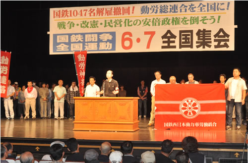 第三は、沖縄や反原発闘争の仲間とともに国鉄闘争全国運動を広げ、韓国・民主労総を始め新自由主義と闘う全世界の労働者と団結しよう。