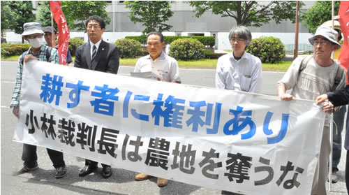 「この署名は、小林裁判長に対する全国の労働者人民・農民の怒りが示されたものです。小林裁判長は重要な弁論と証人調べ・立証活動がこれから始まるという矢先に突然、3月4日に結審を強行するという暴挙をはたらきました。その上今度はいまだ裁判官忌避申立が特別抗告中で確定していないにもかかわらず、判決期日指定を6月5日夕方の通知からわずか1週間後の6月12日にしました。これは民事訴訟法第26条に明らかに違反する前代未聞の暴挙です」「小林裁判長には、実質上の強制収用=農民殺しの手先になるのかどうかが問われています」