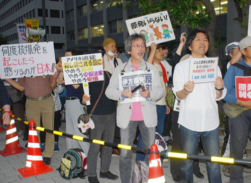 年配の男性は「原発事故は終わってない。福島県ではたくさんの子どもたちが甲状腺がんになっている。原発なんかいらない。避難もできない原発はやめてください。安保法制をやってる場合じゃない!」と叫んだ。
