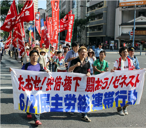 橋下打倒集会実行委員会と外登法・入管法を撃つ関西交流集会実行委員会の共催で「たおせ!安倍・橋下/闘おう!ゼネスト/6・21民主労総連帯行動」が大阪市内で行われた。