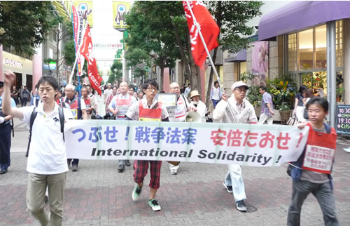昼からは「ゼネスト連帯・安倍打倒」を訴える街頭宣伝を行い、午後3時から「民主労総ゼネスト連帯・つぶせ戦争法案!緊急集会・デモ」(主催/とめよう戦争への道!百万人署名運動みやぎ)に合流した。