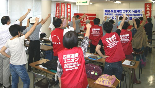 続いて、昨年の8・6ヒロシマ闘争をともに闘った城西(ソンソ)工団労組のイムボンナム委員長のメッセージが読み上げられた。イム委員長はMERS(中東呼吸器症候群)事態とパククネ政権の弾圧を打ち破り、第2次ゼネストへ闘う決意を語った。そして「国籍をこえ、性別をこえ、雇用形態をこえて『労働者はひとつ』です。闘う労働者が世界を変えます。私たちは一緒に労働者が主人公になる社会のため、希望の紐(ひも)を離さず、一歩ずつ前進していきましょう」と熱烈に訴え、参加者全員が奮い立った。