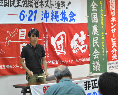 6月21日、沖縄労組交流センターが主催する「民主労総ゼネスト連帯!沖縄集会」が、新しい青年労働者も参加して那覇市内で開催された。