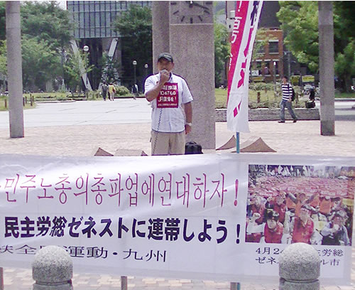 6月21日、国鉄闘争全国運動・九州の主催で、JR博多駅前で民主労総ゼネストに連帯する街頭宣伝が行われました。