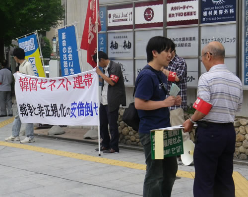 6月21日午後5時から新潟駅万代口で、新潟県労働組合交流センター、新潟地域一般労働組合の共催で、韓国ゼネスト連帯を呼びかける街宣活動を20人の参加で行った。戦争と非正規職化の安倍を倒そうと、参加者はマイクを握って訴えた。