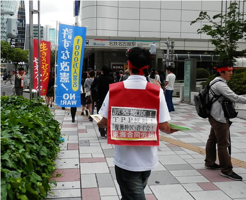 名古屋駅前では、トヨタ自動車オフィスの向かい側で情宣を行い、『前進』速報版200部、7・5チラシなど150セットを配布しました。