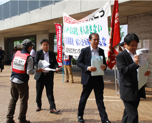 全逓部会などの情宣に対しては共感の声が多く上がった。全国の仲間が用意したビラは合計5千枚以上。そのすべてが配布された。6・7集会の大成功を報じた『前進』速報版と『前進』2685号も、合わせて300部が代議員・傍聴者の手に渡った。昼休みには青年労働者を先頭にマイク宣伝を行い、「新大阪局では『解雇撤回』で3波のストを貫徹した」「闘う労働組合をつくろう」「株式上場に反対を」「『被曝労働拒否』で闘おう」「国際連帯で戦争阻止を」と訴えた。同時に行った〝戦争絶対反対! 許すな改憲! 1000万人署名〟にも「安倍は最低だ」「頑張って」と多くの協力が寄せられた。マイク宣伝中の仲間に代議員が近づき「元全逓の組合員です。頑張ってください」と語り、署名にも快く応じてくれた。