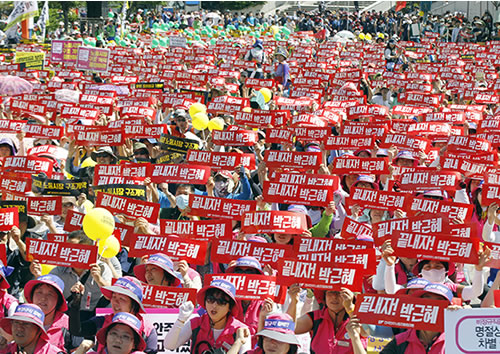 (写真 「終わらせよう!パククネ」のボードを手に、7・15ゼネストへ進撃の決意を固める民主労総労働者大会参加者【6月27日 ソウル】)