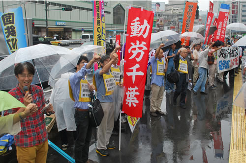 JR東日本が駅業務外注化の攻撃に踏み切った7月1日当日、全国労組交流センターは国会闘争と一体のものとして、正午からJR東日本本社への抗議行動と街頭宣伝を行った。小雨の中、動労千葉、動労水戸、動労神奈川など50人がJR新宿駅前に結集し、シュプレヒコールを上げ、マイクアピールとビラまきを展開した。ビラは吸い込まれるように受け取られ、新宿駅を利用する人びとからは事故を多発させるJRや、安倍の安保法制への怒りが発せられた。