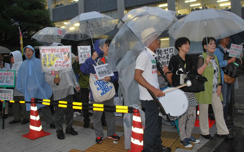 6月26日の金曜行動は雨のため首相官邸前だけでの開催となった。いつもは国会前での行動に参加している人たちも官邸前に合流し、いっそう元気な金曜行動となった。