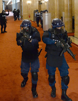 (写真 国会議事堂内で銃を構える特殊部隊【5日】)