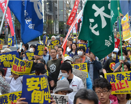 (1)戦争放棄の憲法9条を踏みにじり、集団的自衛権行使を認めた閣議決定から1年が経ちました。安倍政権は、国会会期を戦後最長の95日間延長してまで11本の戦争法案の成立をたくらんでいます。
