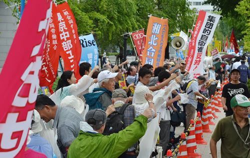 毎日新聞が17、18両日に行った全国世論調査では、安倍政権の支持率は35%に急落、不支持率は51%に上昇し、強行採決を「問題」とする意見は68%、「説明不十分」は82%に達した。他社の世論調査でも軒並み支持・不支持が逆転した。また22日に公表された共同通信社の世論調査では、憲法について「このまま存続すべきだ」は60%となり、「変えるべきだ」の32%を大きく上回った。安倍はこれらの結果に大衝撃を受けている。こうした怒りと闘いの高揚の中で、ゼネストを求める大衆的な声が急速に広がっている。7月10日、出版労連は定期大会で産別統一スト権として「言論・出版・表現の自由を守り、憲法改悪に反対するストライキ権」を確立した。これが新聞などで伝えられ、「今こそストライキで闘う時だ」という声が全国の職場で上がっている。
