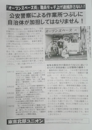 7月27日、東京都練馬区の障害者就労支援事業所「オープンスペース街(まち)」(以下「街」)の職員2人が「就労支援の給付金水増し請求」なる「詐欺」容疑をデッチあげ不当逮捕するという許し難い弾圧が起きた。