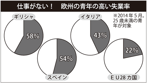 ユーロ圏の失業率は依然として11・1%(5月)という高率である。高い失業率が構造化している。どこの国でも青年の失業率が高い(図)。新自由主義のもとで非正規職化が進み、生活するにも困る低賃金しか受け取れない。社会保障制度の解体攻撃も激しい。