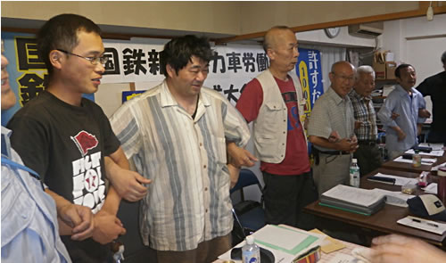 (写真 動労総連合・新潟の結成大会でインターナショナルを歌う組合員たち【7月30日 新潟市】)