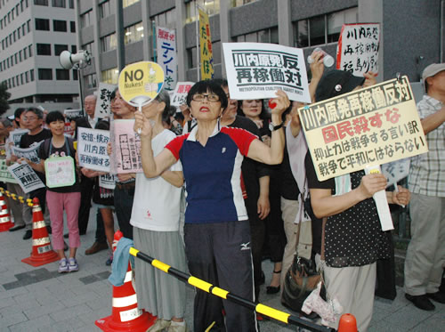 8月7日、首相官邸前(写真)、国会前で金曜行動が行われた。安倍政権が週明けにも九州電力川内原発1号機(鹿児島県)の再稼働を強行しようとしている緊迫した情勢の中、多くの労働者人民が駆けつけて闘いぬいた。