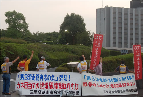 7月29日、三里塚芝山連合空港反対同盟と支援連は、石毛博道(成田空港地域共生・共栄会議委員)、相川勝重(芝山町長)らの「成田第3滑走路実現を目指す有志の会」発起人会開催に対して、反撃に立った。