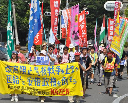 最後は未来を担う青年労働者の発言だ。川内(せんだい)原発再稼働阻止を先頭で闘うNAZEN福岡の田宮星さん、広島の教育労働者・倉澤憲司さんが、ほとばしる怒りで安倍打倒を表明。 NAZEN広島の渡子(とのこ)健さんが「この場で怒らなくていつ怒るのか! 広島・長崎、沖縄、福島、すべての怒りを共有しよう」と訴え、「被爆70周年8・6ヒロシマ・アピール」(別掲)を読み上げた。