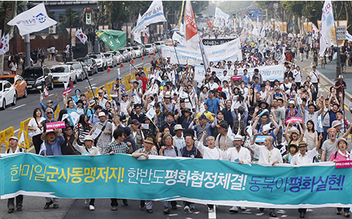 大会参加者はその後、同じ場所で開催された民族統一大会、続く反戦平和汎国民大会に合流し、最後に「韓米日軍事同盟阻止! 韓半島の平和協定締結! 東北アジアの平和実現!」の横断幕を先頭にソウル都心部での大デモを展開した。