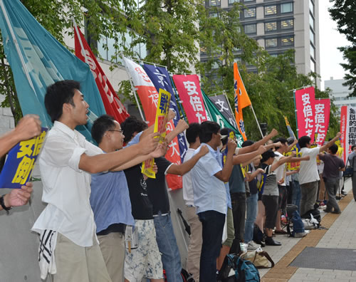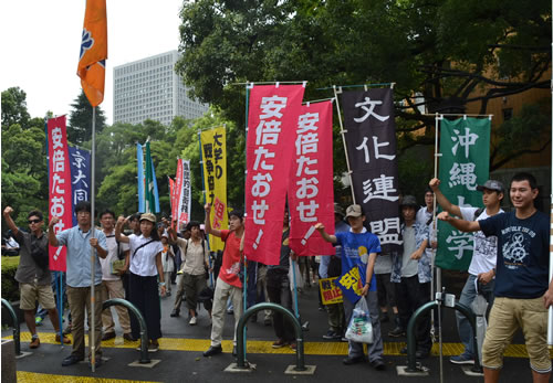 シュプレヒコールを上げ、霞が関を席巻するデモに出発した。首都・国家中枢に「安倍政権打倒!」を強力に突きつける学生のデモが登場したことで、官公庁街、ビル街の雰囲気が一変した。