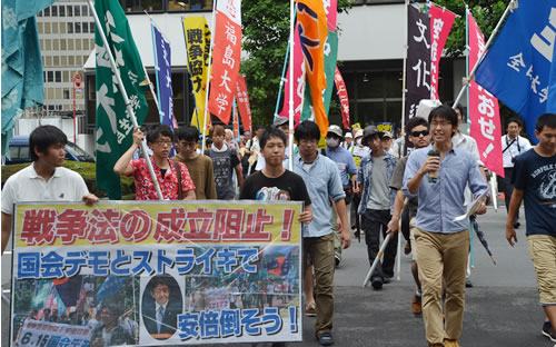 宣伝カーからは絶え間なく安倍の戦争政治と大学の戦争協力を弾劾するコールが大音量で発せられ、「戦争法の成立阻止! 国会デモとストライキで安倍倒そう」と書かれたカラー写真入りのパネルと、林立する全国の大学旗を前面に押し立て、デモ隊は力強く進撃した。昼休みで外に出て来た沿道の労働者からは、大注目を浴びた。