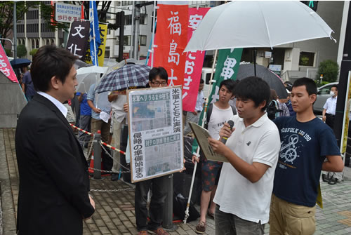 正門前で参加者一同が見守る中、対応に現れた「地方企画室の佐藤」と名乗る職員に対し、吉田悠君が防衛大臣・中谷元宛の全学連の申入書を読み上げた。