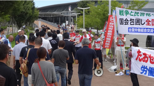 全国労組交流センター自治体労働者部会と地元、北陸・金沢の仲間、総勢40人の大部隊は、前段、23日の全国現業総会と24日からの本大会会場前に連日、登場しました。参加してくる全国の代議員・傍聴組合員に、「戦争・民営化・非正規化を実力阻止! 国会包囲し全国ストで安倍倒そう」と訴える自治体部会のビラと横断幕、アジテーション、さらに8・29いわき闘争を呼びかける動労水戸支援共闘のビラなど5千枚と『前進』550部を販売・配布し、短時間で戦争・改憲阻止1000万署名を310筆、星野署名64筆を集めることができました。