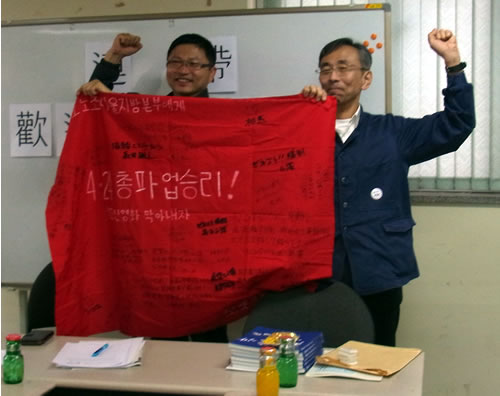 日本の千葉動力車労働組合同志のみなさん、みなさんの闘争は正当です。みなさんの要求は正義感あふれるものです。資本と権力の影響の下にある裁判所が、でたらめな判決を出しても、真実とみなさんの誇り高い闘争意志を打ち砕くことはできません。鉄道を資本に譲り渡し、労働者を思いのままに解雇することに反対しないならば、民主労組ではありません。資本の奴隷であるだけです。