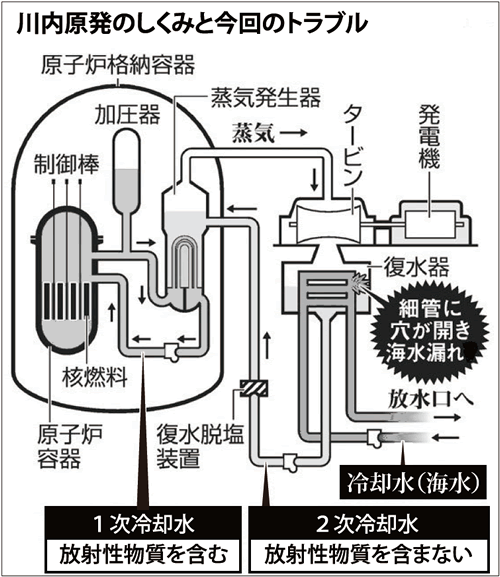 九電でも1998年に玄海原発1号機で復水器細管の漏洩(ろうえい)や、2011年、同4号機で復水器の異常検知などの事故が起きている。川内原発でも、復水器ではないが蒸気発生器で細管の損傷が過去3度起きている。