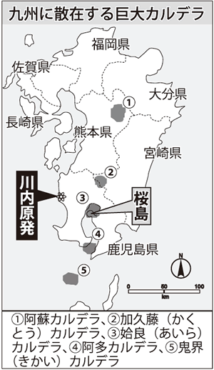 日本では、数十立方㌔メートル以上のマグマを噴出するカルデラ噴火は6千年に1回程度起こっている。一度カルデラ噴火が起こると、その周囲100〜200㌔メートルの範囲は数百度の高温の火砕流に襲われ、壊滅状態となる。7300年前の鬼界カルデラの噴火はすさまじく、火砕流が流れた距離は80㌔近くに達した。その時の火山灰が南九州に1㍍も積もり南九州の縄文文化は壊滅したと言われている。