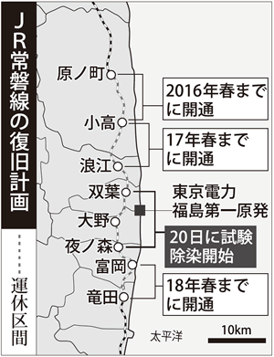 3・11福島第一原発爆発事故で寸断された常磐線は現在、竜田駅(楢葉町)―原ノ町駅(南相馬市)が不通となっている。政府は原ノ町駅―小高駅を16年春までに、小高駅―浪江駅を17年春までに、竜田駅―富岡駅を18年春までに開通する方針を打ち出している。
