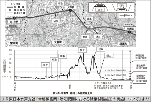 しかし富岡駅―浪江駅間は放射線量が高すぎるため、今も運行再開の見通しが立っていない。そこでJR東は、同区間の中でもとりわけ線量が高い区間の「試験除染」を始めたのだ。
